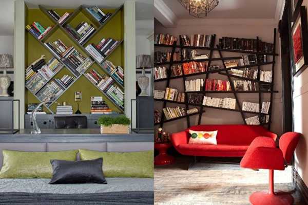 В гостиной или спальне можно обустроить импровизированную библиотеку. Сложные конструкции до самого потолка светлого или насыщенного черного цвета впишутся в современный стиль. Кстати, очень свежо выглядят сооружения ломаных форм.