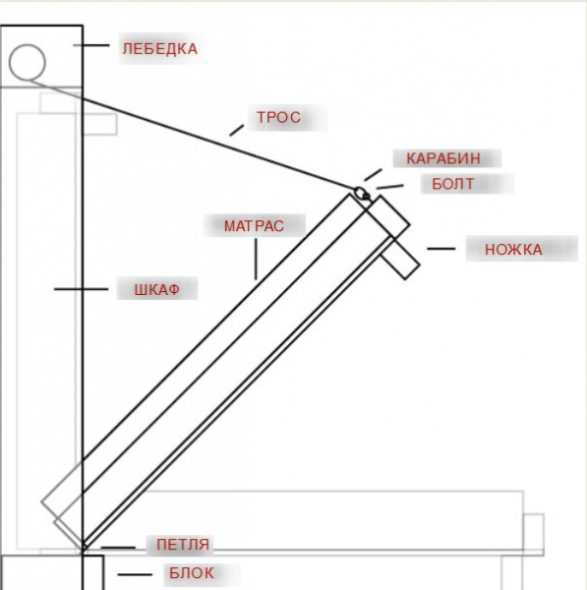 При выполнении откидного блока необходимы грамотные расчеты, чтобы избежать перегрузки короба. Подвижная часть должна облегчать конструкцию. Механизм подъемный у кровати может быть представлен гаражными завесами, сплошной осью либо цапфами с подшипниками.