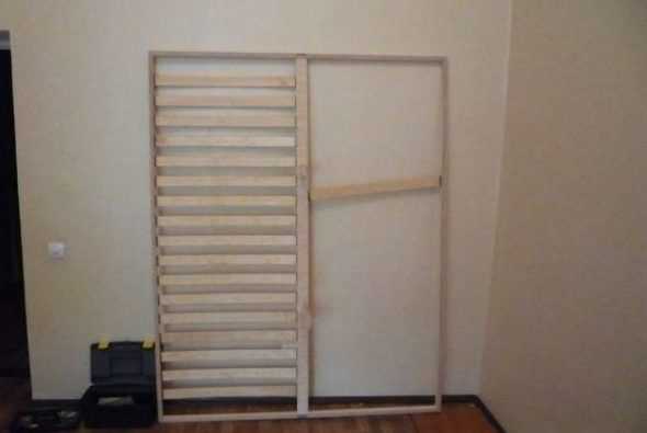 Собирая мебель трансформер своими руками, с внутренней стороны сбоку расположенной основной составляющей, спинки и изголовья нужно установить горизонтально зафиксированные бруски с сечением 47×27 мм. Произвести эти работы можно посредством шурупов и клея. После можно приступать к монтажу опорных брусков. Их нужно установить так, чтобы на спинку и изголовье приходилось по 3 бруска: один из них должен располагаться в центре, два других — по бокам. На сбоку расположенный блок понадобится использовать два бруска, которые предстоит поставить недалеко друг от друга, где фиксируется центральная составляющая.