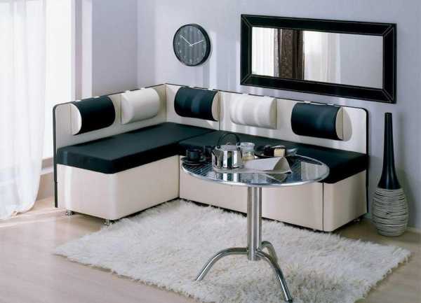 - Угловая конструкция. Компактная, чаще всего стоящая рядом с обеденным столом модель с имеющимся спальным местом.