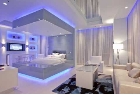 Решившись на подобное освещения, преодолевайте соблазн расположить его в нескольких местах — чтобы ваш дом не утратил эстетики и ощущения дома, используйте такую подсветку только в одной комнате и не более пяти точек. Лампочки по мощности ставьте тусклые, чтобы они давали мягкий легкий отблеск света.