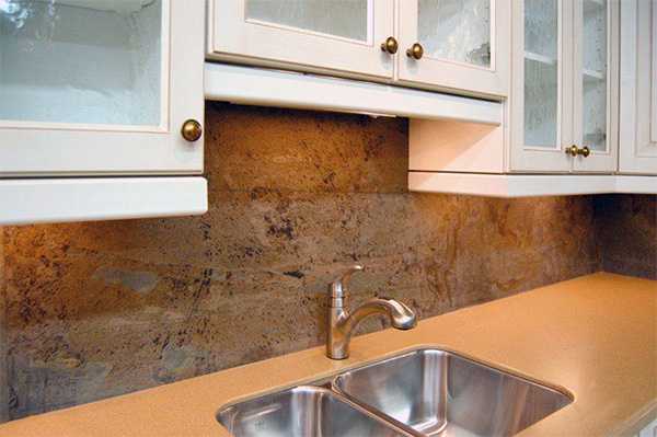 Дорогой, но прочный и долговечный материал. Особенно впечатляет, когда из него сделаны: фартук, столешница и мойка. Редко применяют для оформления фартука из – за своей стоимости. Однако он пользуется популярностью у тех, кто обустраивает свое жилье из экологически чистых материалов. Он не боится влаги, высоких температур, химических и механических воздействий. В случае надобности его легко можно реставрировать.