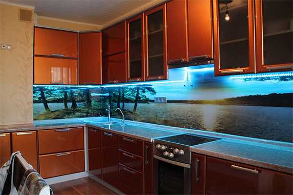 Поэтому все большей популярностью пользуются стеновые панели из каленого стекла. В отличие от обычного, оно устойчиво к жару и царапинам. Имеет высокую прочность. Это дорогой материал для отделки, но он стоит своих денег. С помощью него на фартуке кухни можно воссоздать цветочные ансамбли, морские пейзажи и даже улицы городов. Можно выбрать любой понравившийся рисунок под такое стекло. Или воплотить свою фантазию и заказать придуманный вариант изображения, что придаст кухне универсальности. Достичь непревзойденного результата помогут