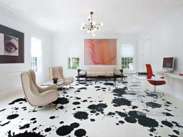Несмотря на то, что в гостиной заливной пол встречается не так часто, как в других комнатах, существует огромный выбор подходящих рисунков. Вы можете создать абстрактную композицию, поэкспериментировать с эффектным изображением животных, подобрать картинки с вечерним городом или живописными пейзажами. Смелым решением будет создание оптической иллюзии на полу.