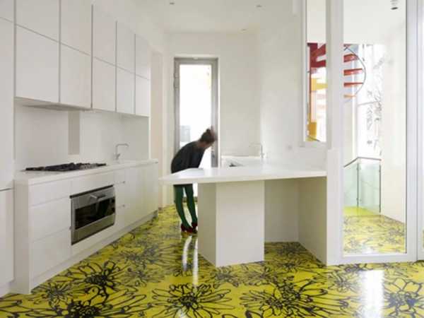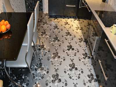 Рисунки для 3д полов в кухне могут быть самыми разнообразными. Здесь, опять же преобладают цветочные мотивы, геометрические орнаменты, хорошо подходит городская тематика с элементами хай-тек (огни ночного города, пейзажи мегаполисов). Идеально, если фартук и полы выполнены в одном стиле и дополняют друг друга. Схожесть тематик на кухне и в гостиной обусловлена тем, что эти два помещения могут выполнять одни и те же функции, а зачастую кухня также является местом, где собирается вся семья.