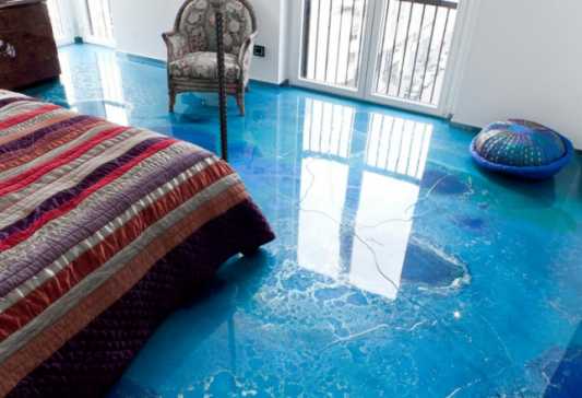 Наливные полы в спальне – это изысканный вариант, который обойдется недешево, но однозначно будет стоить потраченных сил и вложений. Полимерное покрытие должно гармонировать с интерьером и смотреться органично на фоне любых дизайнерских элементов. Выбирая картинку, рекомендуется отдавать предпочтение ненавязчивым рисункам в спокойной цветовой гамме. Согласитесь, что крутые горные склоны с трещинами, вулканы с горящей лавой – это не то что хочется ежедневно видеть перед сном.