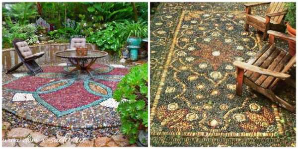 Много что можно сделать на приусадебном участке из камней. К примеру, из гальки можно сделать настоящий ковер. Получится — вообще шедевр.