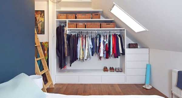 Обязательно используйте свободные углы – угловая гардеробная вмещает в себя значительно больше вещей, чем обычный шкаф. Форма хранилища может быть практически любой – например, трапеции, треугольника, пятистенков, буквы «Г». «Начинку» делать тоже довольно просто: