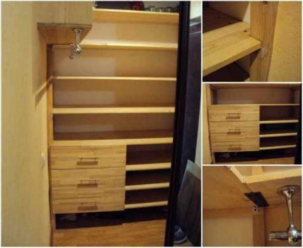 Что касается полок, то вы можете сделать их из обыкновенного дешевого ламината, который нужно предварительно порезать на указанную длину. Чтобы ширина полок была соответствующей, ламинат соединяют замками. Теперь можно заняться раскладкой вещей.