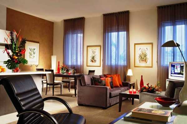Всем известно, что использование тёмных оттенков для оформления комнат со скромными размерами способно зрительно уменьшить и без того недостающее пространство. Поэтому каким бы поклонником тёмной гаммы ни был хозяин квартиры, её следует избегать в маленьких залах. Поэкспериментировать с такой расцветкой можно позволить в просторных комнатах, главное, выбрать неугнетающие оттенки. Чтобы немного разбавить пространство в тёмной гамме, можно при отделке использовать полотна двух сочетающихся цветов.