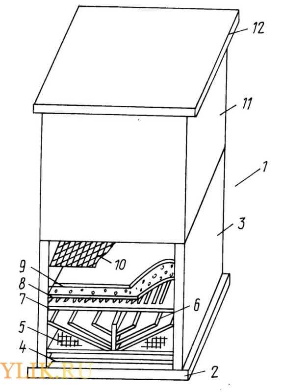 Этот универсальный улей Кузнецова имеет в своем составе такие части, как: корпус, который состоит из последовательно установленных элементов — основания (2), корпуса (1, 3, 11) с дном (4) и поддоном (5), сеткой для главного корпуса(10) и крышкой (12). Донный корпус оснащен пылеулавливателем (6), он расположен над сеткой, а состоит из множества парно прикрепленных пластин, которые устанавливают под углом к горизонту. В поперечном сечении он имеет форму елочки. Очень полезен для сбора пчелами пыльцы.
