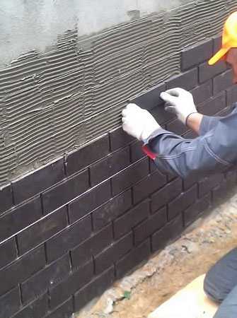 Плитку приклеивают на выровненную и загрунтованную поверхность фундамента. Чтобы ровно уложить плитку, предварительно на стену наносят разметку. Можно приклеивать плитку не только непосредственно на бетон, но и на теплоизоляцию. Начинают укладывать плитку от угла, при этом сразу необходимо сделать 4 ряда. Клей, выступающий из швов, герметизирует их. После окончания работ следует на 2-3 дня закрыть фундамент от попадания осадков. За это время клей высохнет. Никакой дополнительной обработки отделанный фундамент не требует.