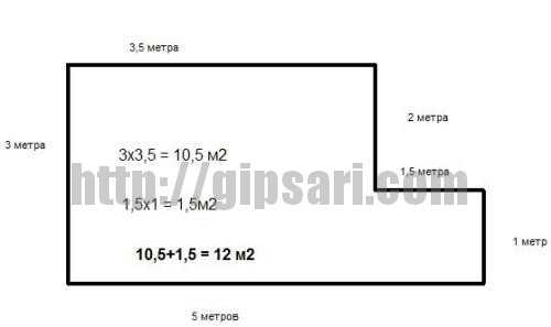 — если у нас длина комнаты 5 метра, а ширина 3 метров, тогда нам надо ( 5*3 = 15 кв.м.), в итоге получаем 15 кв.м. по полу