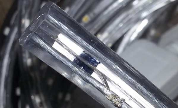 Светодиодная лента 220 vМетровый отрезок состоит из двух кусков по 0,5 метра, спаянных между собой. На каждом полуметровом отрезке установлены по 14 резисторов номиналом 220 Ом. В одном метре получается 28 резисторов с суммарным сопротивлением 6160 Ом. Количество светодиодов в одном метре диодной ленты 60 штук: 30 пар включенных параллельно. Лента шириной 6,4 мм находится в прямоугольной силиконовой защитной оболочке. По бокам ленты в оболочку по всей длине залиты два провода питания, от которых к каждому метровому отрезку ленты припаяны перемычки — в ого начале и конце. Получается, что каждый метровый отрезок подключен к напряжению 220 вольт.