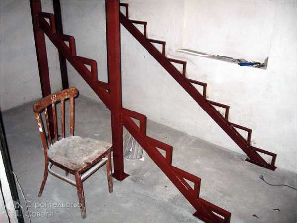 Строить лестницу необходимо начинать с того, что швеллер режется на части и из них собирается каркас. К боковым граням каркаса приварить уголки через равные промежутки, которые будут равны высоте ступеней. Все уголки обязательно должны располагаться строго параллельно один к другому. Верхние концы рамы прочно зафиксировать и прикрепить к перекрытию верхнего этажа, а нижние закрепить на полу. Затем привариваются ступени из листового железа, а также перила. На завершающем этапе готовая конструкция обрабатывается специальными антикоррозионными смесями. Чтобы не переделывать конструкцию, необходимо все этапы проводить последовательно и строго соблюдать все правила ее возведения.