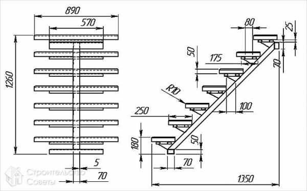 При наличии всего этого, а также подходящего материала можно приступать к монтажным работам. Что касается подборки материала, то это можно сделать согласно выполненному чертежу. Предлагаем вам ознакомиться с принципом изготовления металлической лестницы на двух косоурах.