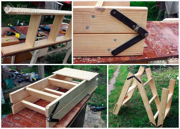 Первый шаг. Прикрепите к нижней части приставной лестницы брус по ширине. Такой же брусок прикрепите к верхней части изделия. При этом нижний брусок необходимо фиксировать жестко, а верхний – на петли.