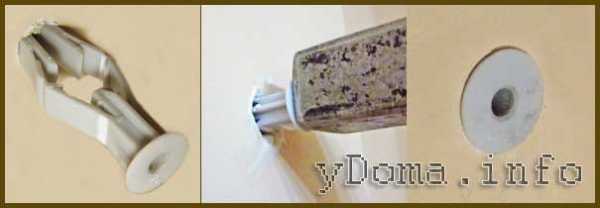 Если работы выполняется на поверхность оформленную гипсокартоном, то использовать нужно специальные дюбеля-бабочки. Они имеют продольные рёбра, которые не дают дюбелю проворачиваться, а стопорный болтик удерживает и не даёт креплению провалиться в стену.