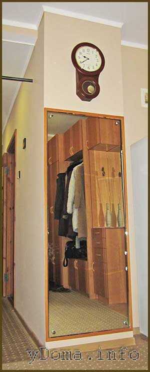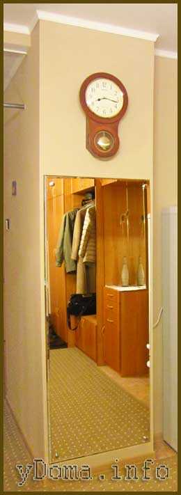 Сегодня при создании интерьера помещений широко применяются зеркала, благодаря которым можно изменить пространство, зрительно раздвинув стены помещения или подняв потолок. Я тоже решил зрительно увеличить свою прихожую и повесил большое зеркало на выступающую из стены колонну. Зеркало также служит по своему прямому назначению, позволяя видеть себя в полный рост. Жене наличие большого зеркала в прихожей очень понравилось.