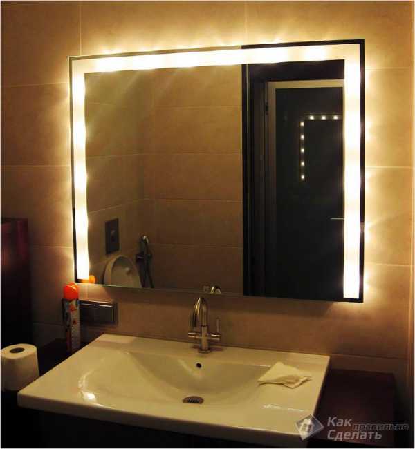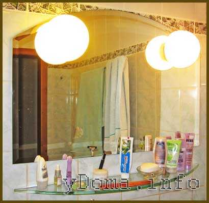 Зеркало делалось на заказ, и в нем для закрепления я предусмотрел два больших отверстия в верхней части. Для того чтобы повесить зеркало на стене, осталось просто надеть его на основания двух светильников. Для исключения перемещения зеркала на пластмассовом корпусе светильников, в нем были сделаны неглубокие пазы шириной в толщину зеркала. Размещение светильников на плоскости зеркала позволило повысить их эффективность, так как свет от обратной стороны плафонов отражается от зеркала и направляется в помещение.