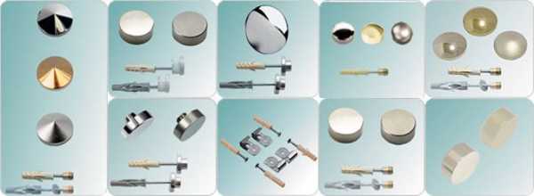 Для определения диаметра крепежных отверстий в зеркале, в мастерской была выбрана фурнитура для крепления. В один комплект крепежа входила латунная втулка с пластмассовой прокладкой, декоративная гайка, саморез и дюбель.