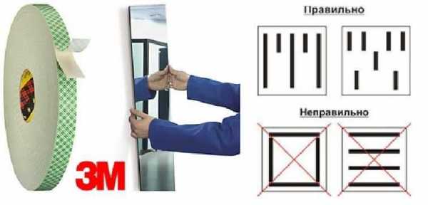 Приклеивать скотчем можно только небольшие зеркала площадью не более одного квадратного метра, так как сила удержания скотча не велика, и надежность такого вида крепления для больших зеркал будет низкой. Зеркало может со временем отвалиться. Зато способ очень простой и не требует высокой квалификации и инструмента. Скотчем нужно покрывать практически всю поверхность зеркала.