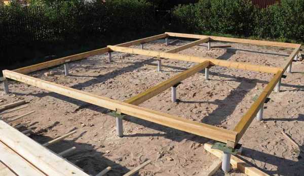 Поверх готовых свай укладывают горизонтальные балки. Такая конструкция называется ростверком. Когда решили построить каркасный дом своими руками, пошаговая последовательность начинается с установки ростверка, который является также нижней обвязкой каркаса с вертикальным креплением стоек на них.
