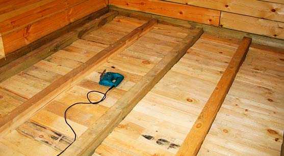 Черновой пол между лагамиДеревянные лаги укладываются поверх нижней обвязки и используются в качестве основы, к которым снизу прибиваются доски чернового пола. На доски чернового пола укладывается утеплитель. Потом уже на лаги расстилается напольное покрытие: ламинат, линолеум, ОСП, паркет.