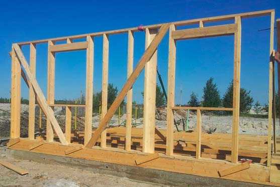 - Собирают отдельно каркас каждой стены (нижние, верхние и вертикальные элементы) – так называемый шаблон стены. После собранный шаблон целиком поднимают и устанавливают на нижнюю обвязку.