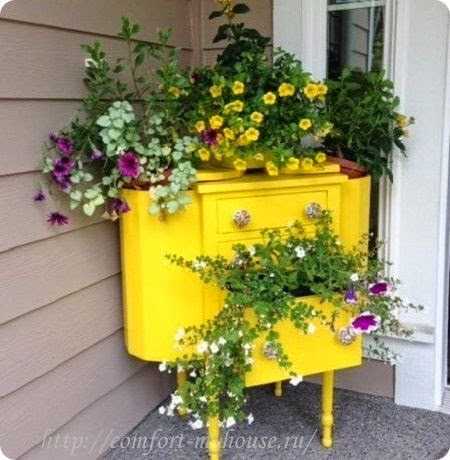 Это могут быть и жестяные банки, окрашенные в яркие цвета, и старая раковина или ванная, стул, тележка, велосипед, тумбочка, сумки и мешки, даже старая обувь.