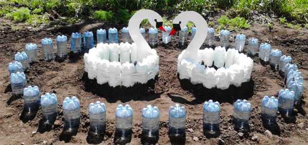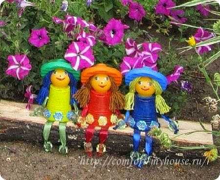 Особой популярностью у дачных дизайнеров пользуются бутылки, пластиковые баночки. Из них легко и просто соорудить множество интересных скульптур, украшений для цветников, бордюров. Здесь нет границ для фантазии.