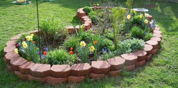 Вокруг клумбы можно сделать небольшой заборчик. Для его изготовления возможно использование пластиковых бутылок или стаканчиков, ограды из тына, камней. Красиво смотрится клумба плавно переходящая в газон.