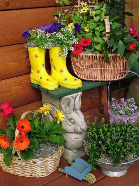 Разные ненужные вещи тоже успешно применяют в качестве вазонов на дачах.