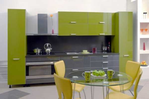 - Зеленый. Сочный цвет весны и настроения удивительным образом сочетается с белым и серым. Большой популярностью зеленый пользуется в современных стилях эко и модерн. Чем ярче зеленый, тем больше его нужно разбавлять серым. Удачным вариантом будут хромированные поверхности бытовой техники, столешницы либо фартука.