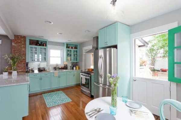 Зеленые стены вокруг белых кухонных шкафчиков. Цвет зеленой травы подходит для мебели в современном стиле, мятный сделает помещение светлее и придаст ретро-настроение. Для деревенского стиля подходят темный мох и оливковый цвет. Бирюзовый наполнит комнату воздухом и светом. Все оттенки зеленого хорошо сочетаются с баклажановым, сиреневым, серым и желтым.