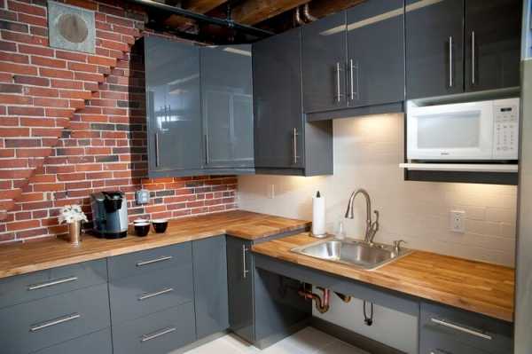 Фото: Оригинальный и живой интерьер небольшой кухни: гарнитур с глянцевым белым низом и серыми полками и стенами, дополнен деревянной столешницей и фартуком под кирпичную кладку.