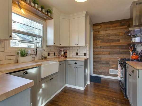 Серая кухня с деревянной столешницей — популярный выбор дизайнеров.