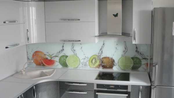 Бывают исключения и оригинальные решения, когда в серо-белой кухне присутствует стеклянный фартук с яркими цветочными композициями, а столешница служит границей между разными оттенками.
