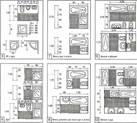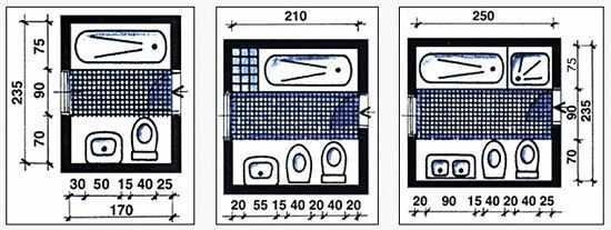 - другое сантехоборудование (унитаз, биде, раковину для умывания) устанавливают вдоль стены с инженерными коммуникациями.