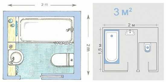 Примеры планировки мини-санузлов площадью 2 кв. метра и 3 м2