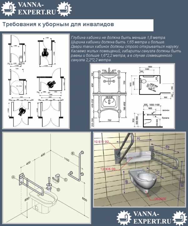 Размеры уборных для людей с ограниченными возможностями рассчитываются исходя из габаритов инвалидной коляски. Так, минимальный размер ванной должен быть не менее 2,3 кв. м, туалет с умывальником от 1,6 м.кв., без умывальника допускается 1,2 м.кв., для инвалидов колясочников ширина санузла – 1650 мм, глубина – 1800 мм.