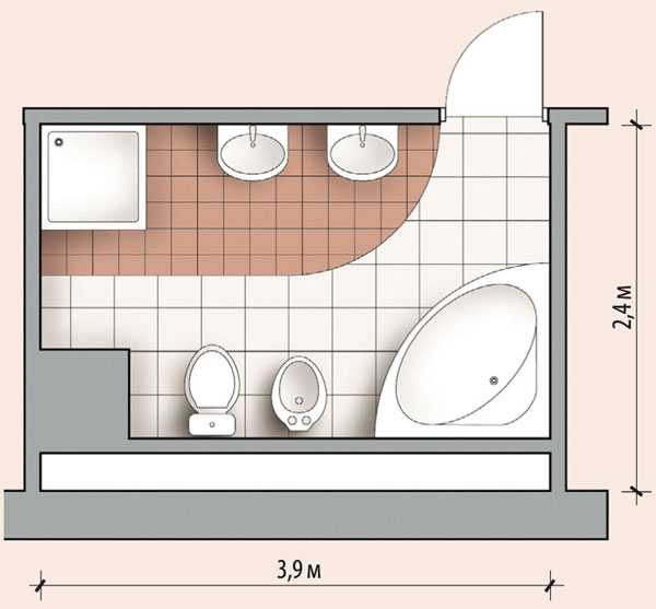 Размещение душевого уголка, раковины и биде в ванной комнате