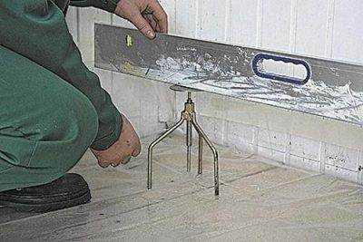 - На следующем этапе нужно установить реперы или маяки для наливного пола. Стоит отметить, что их цена не слишком высока, а рассчитаны они на многоразовое использование. Устанавливают первый маяк именно на самом высоком месте.