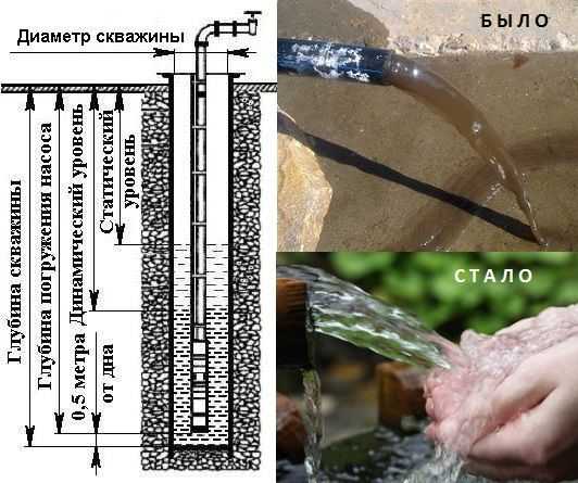 Сначала нужно опустить насос поближе к дну скважины и полностью выкачать из нее воду. Об этом сообщит характерный “всхлипывающий” звук работающего насоса.