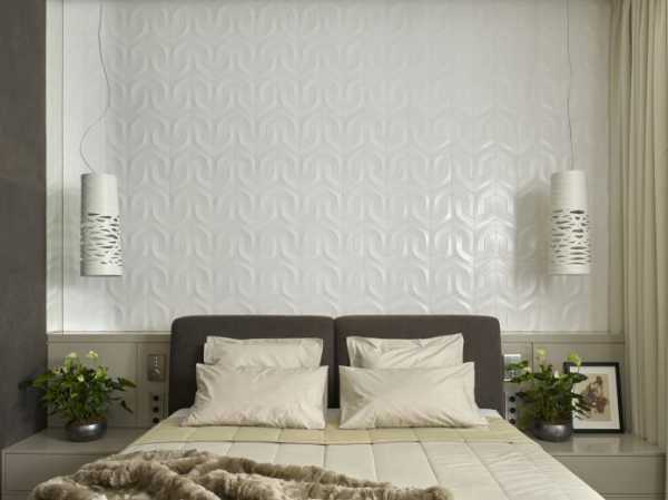 - Панели, как правило, имеют небольшой формат, монтируются на клей, что делает этот вид отделки наиболее простым. Использовать 3Д панели можно в интерьере спальни, оформляемой в стиле минимализм.