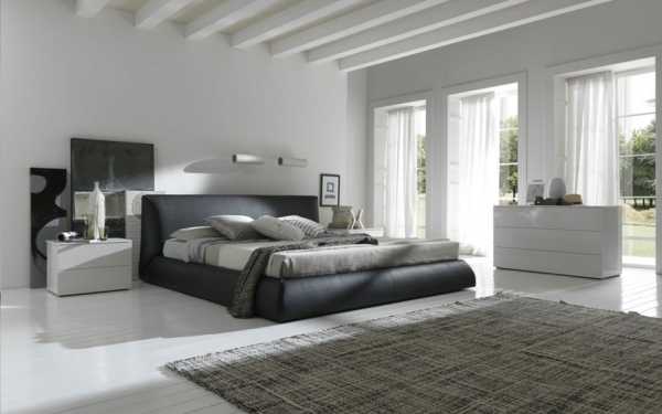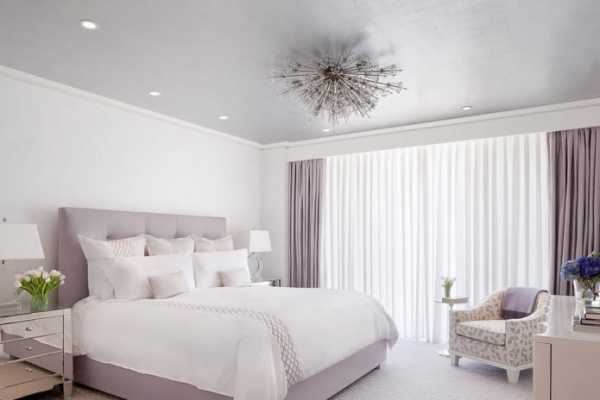 Для минимализма и большинства стилей интерьера характерен одноуровневый белый потолок. Это классика, которая не выйдет из моды. Если вы хотите привлечь дополнительное внимание к отдельной части спальни, то можно прибегнуть к гипсокартонным конструкциям. Двухъярусные потолки можно преобразить в самостоятельное украшение комнаты, если разместить по всему периметру точечные лампочки. Натяжные потолки имеют свои преимущества: они помогут создать свой особый, индивидуальный интерьер, поскольку вариации оформления таких потолков бесконечны. Также натяжные потолки с эффектом зеркальной поверхности, позволяют расширить визуально комнату, даже крохотная спальня сможет стать больше.