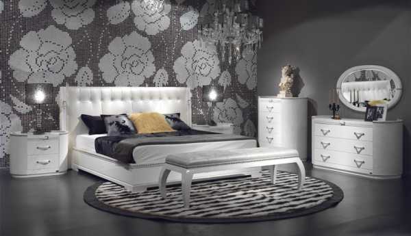Смотрите на фото: те же розы, только в другом качестве. Да и цвет для спальни необычный – серый. - Но, как видите, серые стены и пол, в сочетании с белой мебелью смотрятся просто великолепно. Просторное помещение со скромной отделкой стен, изящной мебелью и хрустальной люстрой выдаёт принадлежность данного интерьера к стилю модерн.