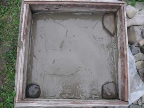 После того, как камни были уложены, с помощью мастерка они с силой вдавливались в раствор. Одновременно заливался раствор и в маленькие формочки. В формах плитка находилась 3 – 4 дня, накрытая целлофаном, поскольку лето было очень жарким. Утром и вечером ее поливали водой, чтобы не образовались трещины. Как только плитка отходила от опалубки, опалубку снимали, а процесс производства плитки продолжался.