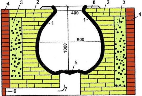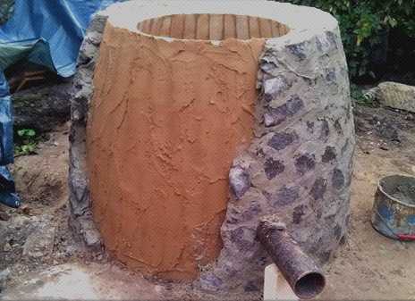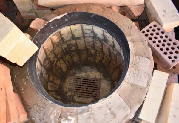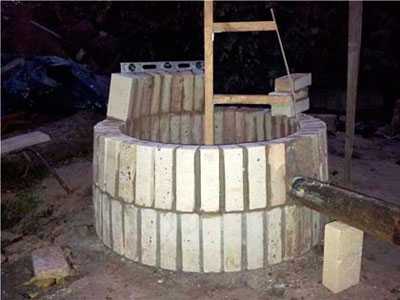 Далее, вокруг вкладки, вплоть до ее горловины, возводятся кирпичные стены, а затем зазоры между глиняными и кирпичными стенками заполняются выше упомянутыми материалами.