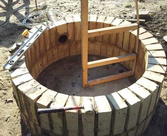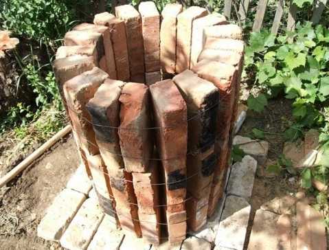 Начинают выставлять по шаблону кирпичи первого ряда. Ставить их следует на узкое ребро торцом к центру так, чтобы получилась стена в полкирпича. Чтобы создать закругление, внешний радиус должен иметь широкий зазор, а внутренний – гораздо меньший.